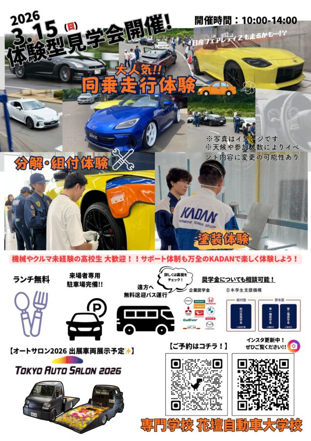 3/15(日)10:00~14:00で授業体験会を開催いたします! 【内容】 ①分解、組付けの作業を学生と一緒に体験 ②…